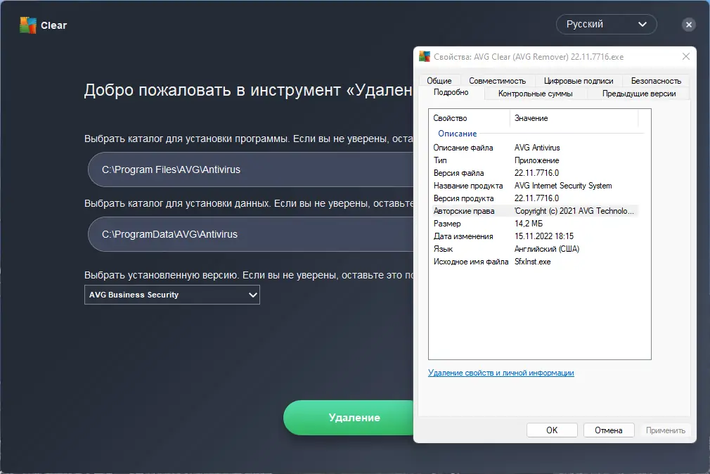 - Полное удаление всех версий продуктов AVG, включая проприетарные службы и драйверы