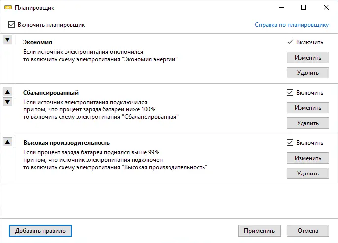 - Встроенный планировщик задач, позволяющий автоматически переключать режимы питания при смене состояния системы — выходе из сна, подключении зарядного устройства или достижении определённого уровня заряда