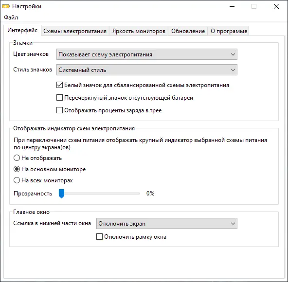 - Управление яркостью экрана через ползунок в интерфейсе программы или колесо мыши при наведении на иконку в трее