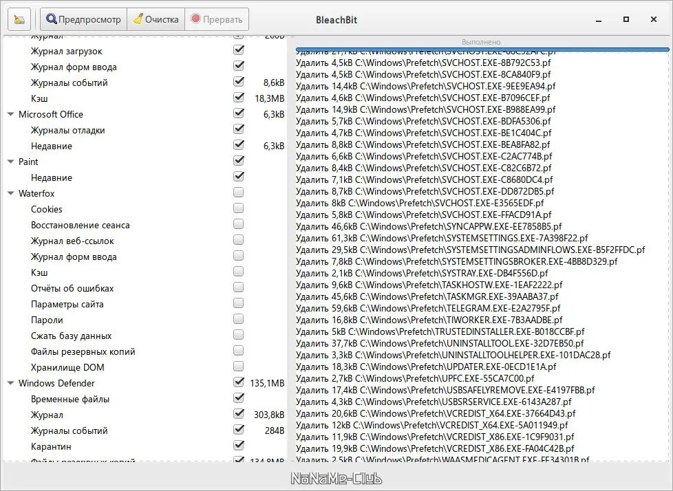 Интерфейс BleachBit интуитивно понятен и организован по категориям приложений и системных компонентов. После запуска пользователь видит список доступных для очистки элементов, каждый из которых можно включить или отключить. Перед выполнением операции доступен предварительный просмотр, где отображается объём данных, подлежащих удалению. Для инициализации процесса достаточно нажать кнопку «Очистить», после чего программа выполнит все выбранные действия. Для расширенных функций, таких как стирание свободного пространства или удаление локализаций, предусмотрены отдельные опции в меню.