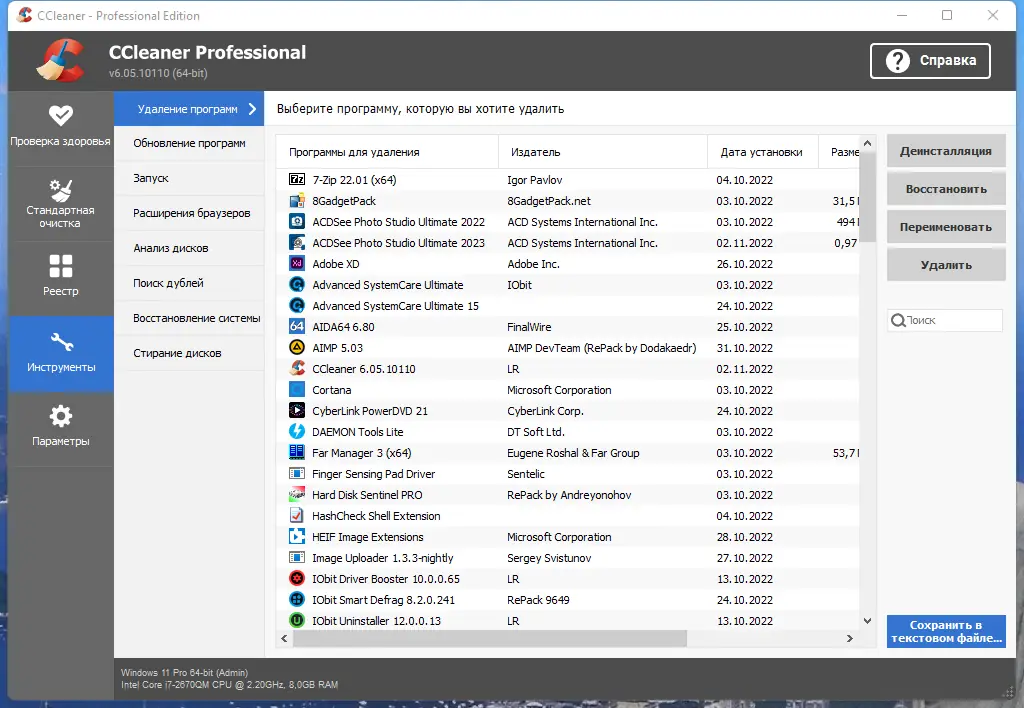 CCleaner — это мощная утилита для очистки и оптимизации операционной системы Windows, удаляющая временные файлы, следы интернет-активности, записи реестра и данные ненужных программ. Программа помогает освободить место на диске, ускорить работу системы и повысить стабильность. Её функции востребованы как у обычных пользователей, так и у системных администраторов.