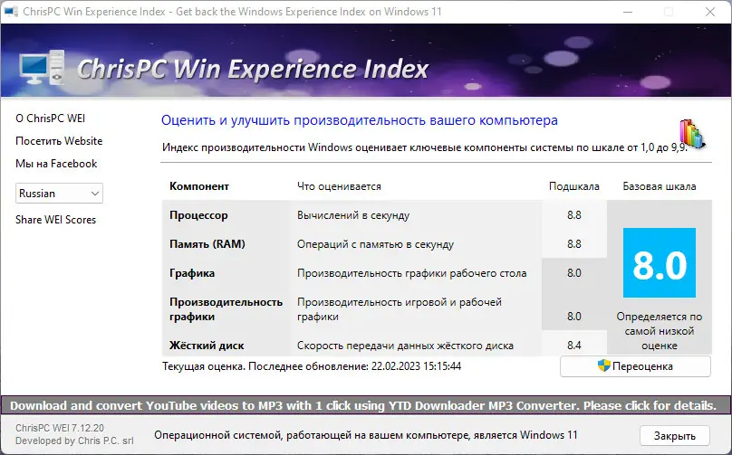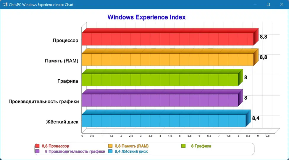 ChrisPC Win Experience Index — это бесплатная утилита для оценки производительности компьютера под управлением Windows, позволяющая восстановить функционал отсутствующего в новых версиях ОС индекса производительности. Программа проводит комплексное тестирование основных компонентов системы: процессора, оперативной памяти, видеокарты и жёстких дисков. Результаты отображаются по шкале от 1.0 до 9.9, что упрощает сравнение и анализ производительности.