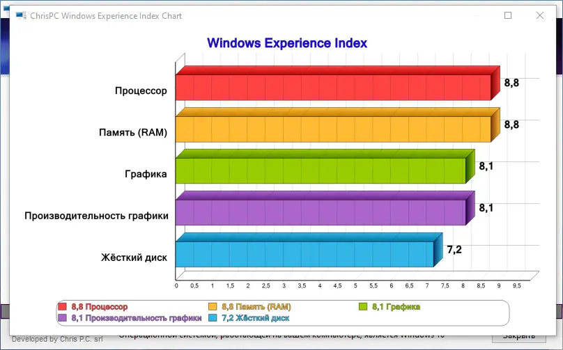ChrisPC Win Experience Index — это бесплатная утилита для оценки производительности компьютера в операционных системах Windows, восстанавливающая функционал устаревшего Windows Experience Index. Программа автоматически анализирует ключевые компоненты системы и выставляет итоговую оценку по шкале от 1.0 до 9.9. Поддерживает современные версии Windows, включая 11, 10, 8.1 и более ранние.