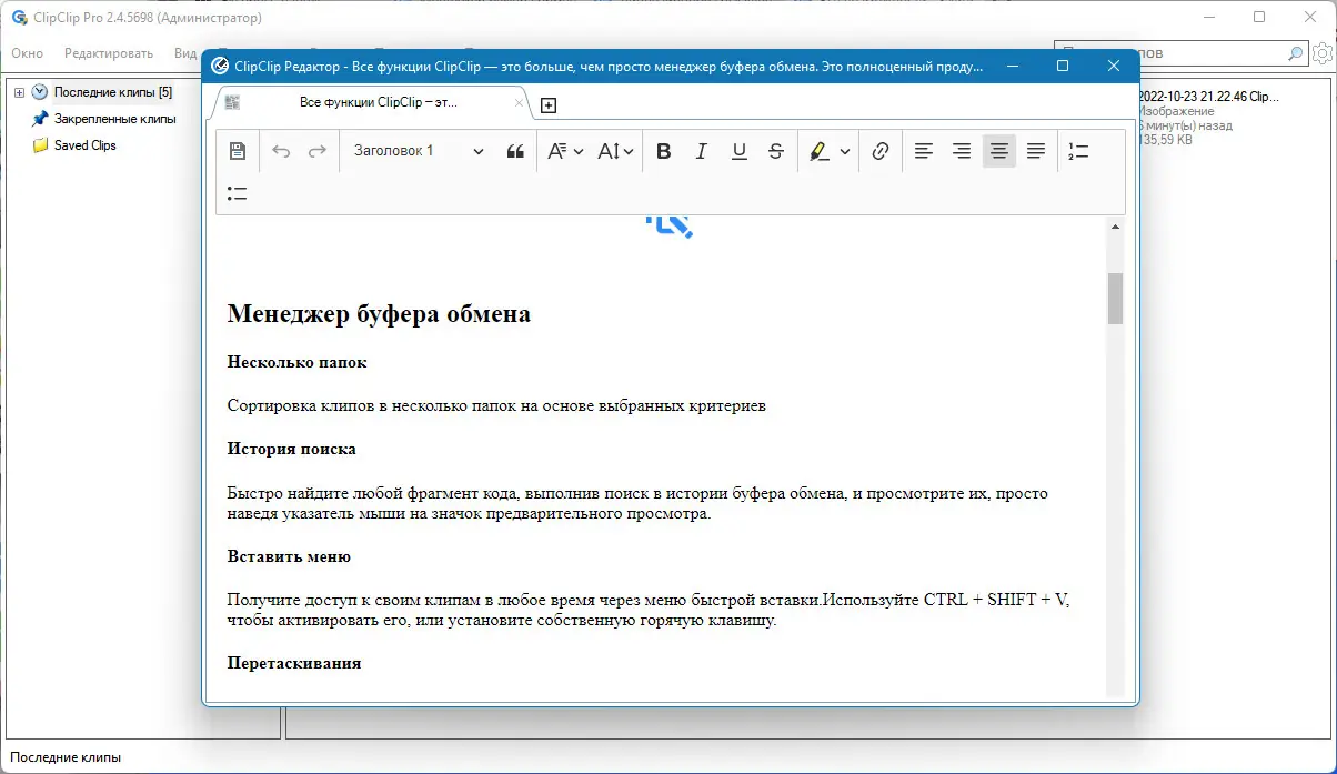 - Программа поддерживает текст, изображения, HTML-код и другие форматы в едином хранилище.
