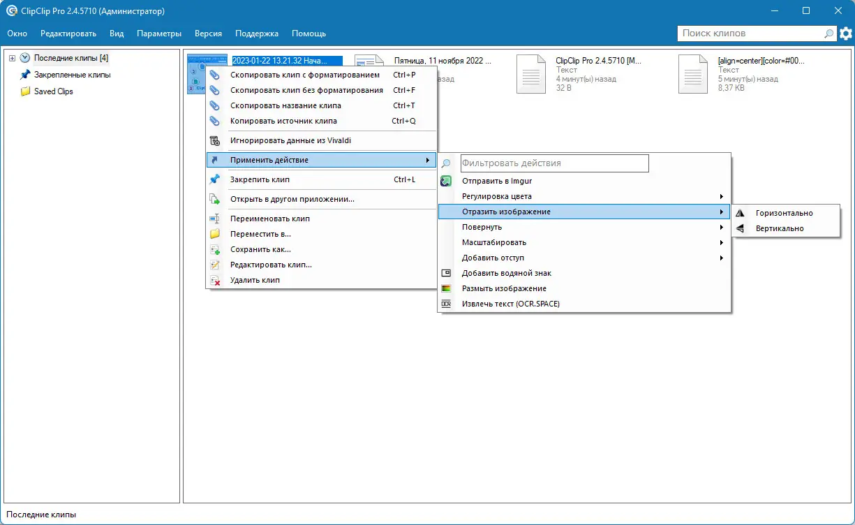 После установки программа начинает работать в фоновом режиме, автоматически фиксируя каждый скопированный элемент. Для вызова меню вставки используется сочетание клавиш Ctrl+Shift+V, хотя его можно изменить в настройках. В интерфейсе отображаются все сохранённые клипы в виде сетки или списка, с возможностью предварительного просмотра. Пользователь может создавать папки, перетаскивать в них элементы, применять фильтры по типу контента и выполнять действия — от изменения размера изображений до отправки по электронной почте. Редактирование текста происходит встроенными инструментами: изменение регистра, удаление лишних пробелов, сортировка строк, кодирование URL и другие функции доступны через контекстное меню.