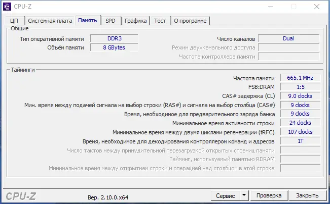 - Показывает объём, тип и режим работы оперативной памяти, включая тайминги и частоту