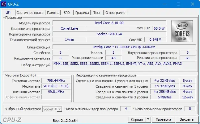 CPU-Z позволяет получить исчерпывающие данные о центральном процессоре, включая его маркировку, производителя, архитектуру ядра, техпроцесс и степпинг. Утилита точно отображает текущую тактовую частоту, коэффициент умножения и напряжение питания, что помогает определить, был ли процессор разогнан. Также программа анализирует поддерживаемые наборы инструкций, такие как MMX, SSE, AVX, что важно для совместимости с современным программным обеспечением и играми.