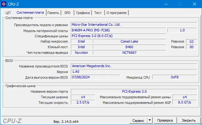 - Показывает производителя, модель и ревизию материнской платы