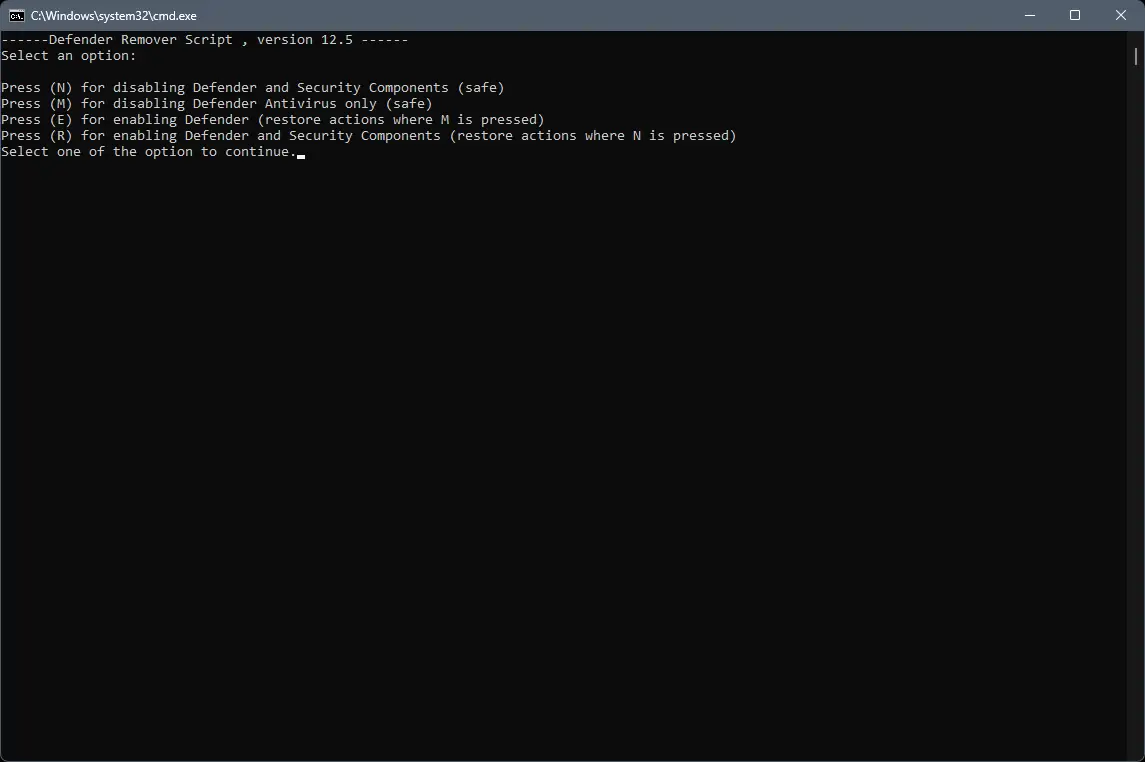 Использование утилиты предельно простое. После запуска откроется консольное окно с текстовым меню, где каждому действию соответствует определённая буква. Пользователю нужно выбрать нужный режим — отключение или восстановление функций безопасности. После подтверждения утилита автоматически перезагрузит систему и применит изменения. Интерфейс минималистичен, но интуитивно понятен даже новичку. Для отмены изменений предусмотрена отдельная опция, возвращающая все службы в исходное состояние.