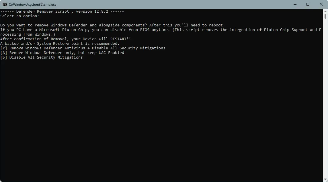 Использование утилиты предельно простое. Достаточно запустить исполняемый файл от имени администратора, чтобы получить доступ ко всем системным функциям. После запуска появляется текстовое меню с вариантами действий, где каждая опция обозначена буквой. Пользователь выбирает нужный режим — отключение или включение защиты — и подтверждает действие. После этого система автоматически перезагружается и применяет изменения.