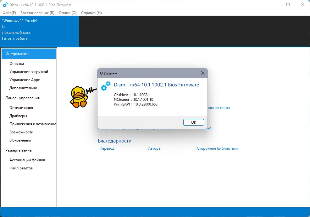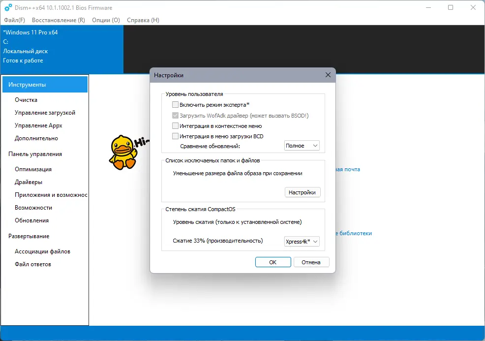 Dism++ — мощная утилита для тонкой настройки и оптимизации операционной системы Windows, предназначенная для продвинутых пользователей. Программа позволяет проводить глубокую очистку системы, управлять компонентами ОС, сжимать установку и работать с образами. Её функционал выходит далеко за рамки стандартных средств обслуживания.