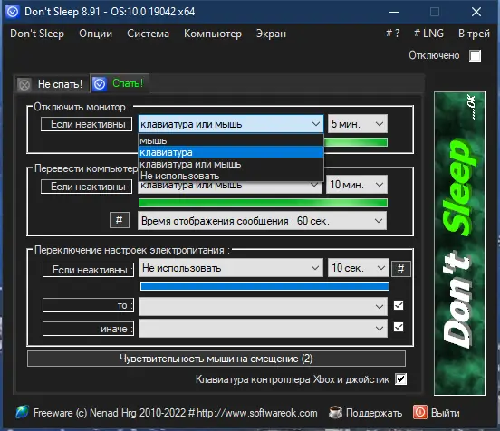 Программа доступна в 32- и 64-битных портативных сборках, совместимых с современными версиями Windows. Конфигурация сохраняется в .ini-файле, что упрощает перенос настройки между устройствами. Don’t Sleep не оставляет следов в системе после завершения работы.