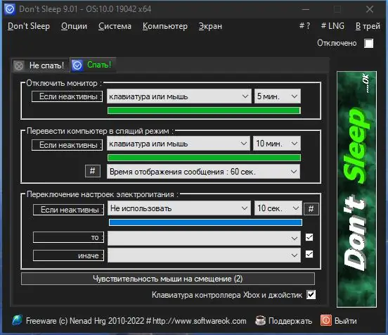 Don’t Sleep предлагает простое и надёжное решение для управления энергопотреблением Windows. Программа не перегружает систему и совместима с различными версиями операционной системы. При этом она не предоставляет расширенные профили энергосбережения, как встроенные средства ОС, но отлично справляется с базовыми задачами. Поддержка таймера и автоматических действий делает её универсальным инструментом для повседневного использования. Утилита не имеет встроенных обновлений, что может потребовать ручной проверки новой версии.