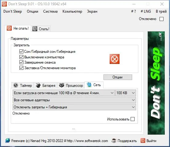 Программа Don’t Sleep разработана для управления настройками электропитания операционной системы без необходимости постоянного вмешательства пользователя. Она позволяет временно отключить спящий режим, гибернацию, блокировку рабочего стола и таймер отключения экрана. Это особенно актуально при работе с приложениями, требующими непрерывного выполнения, например, торрент-клиентами или видеозахватом. Утилита поддерживает гибкие настройки, включая таймер автоматического завершения сессии.
