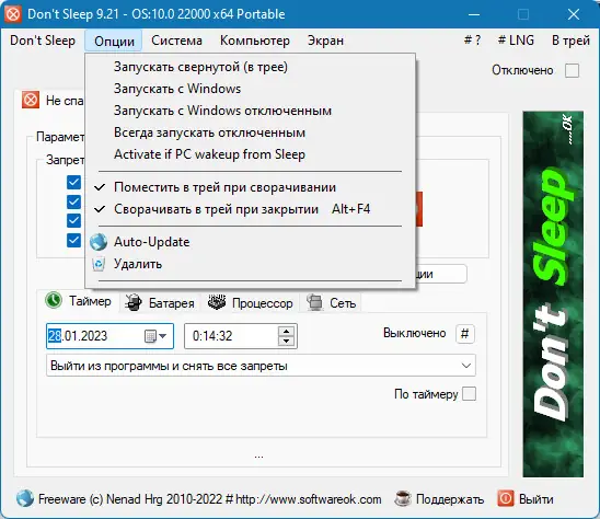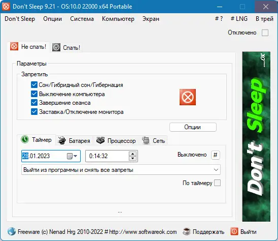 Утилита Dont Sleep позволяет временно отключить функции энергосбережения операционной системы, предотвращая переход компьютера в спящий режим, активацию экранной заставки или блокировку рабочего стола. Программа идеально подходит для ситуаций, когда требуется длительная работа без перерывов, например, при загрузке файлов, воспроизведении медиа или выполнении фоновых задач. Она обладает гибкими настройками и поддерживает таймер для автоматического завершения сеанса.