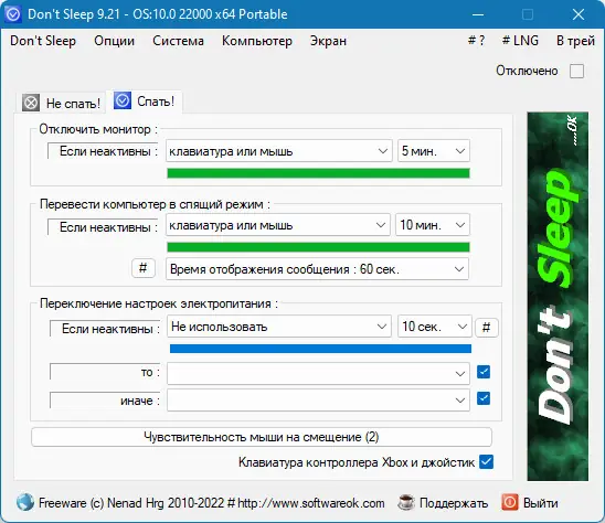 Программа Dont Sleep предназначена для управления параметрами электропитания в Windows, позволяя пользователю временно отключать спящий режим, гибернацию, блокировку экрана и активацию хранителя экрана. Это особенно актуально при использовании устаревшего программного обеспечения, которое может некорректно взаимодействовать с современными энергополитиками системы. Утилита не вмешивается в работу ОС глубоко, а лишь приостанавливает определённые функции на заданный срок.