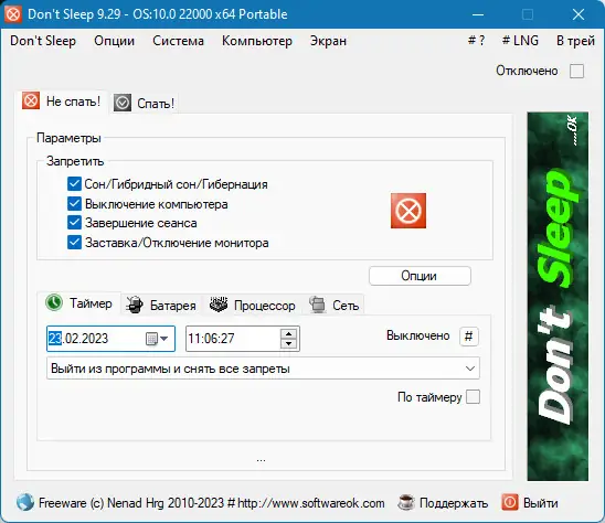 Dont Sleep — это компактная системная утилита, предназначенная для временного отключения режимов энергосбережения операционной системы. Программа позволяет предотвратить переход компьютера в спящий режим, гибернацию, блокировку экрана или активацию хранителя. Особенно полезна при выполнении длительных задач, требующих непрерывной работы системы.