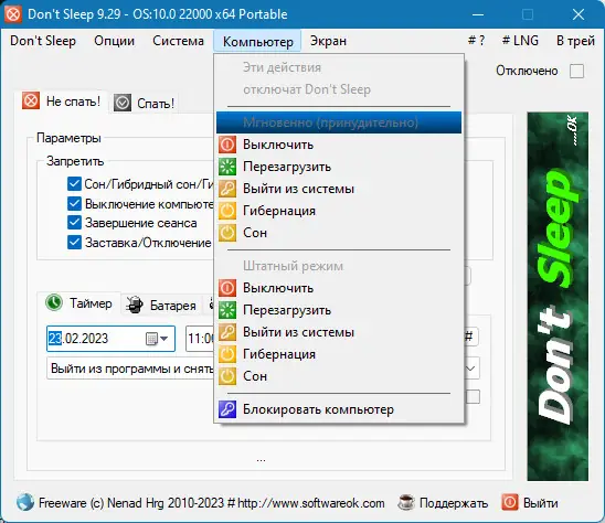 Dont Sleep разработана для управления настройками электропитания без необходимости вмешательства в системные параметры вручную. Утилита работает в фоновом режиме и даёт пользователю полный контроль над состоянием компьютера. Она позволяет отключать спящий режим, гибернацию, блокировку рабочего стола и отключение монитора на указанный промежуток времени. После завершения отсчёта программа может автоматически выполнить заданное действие — выключить, заблокировать или перевести ПК в сон.