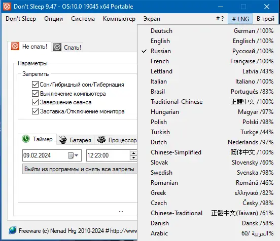 Интерфейс утилиты интуитивно понятен и не перегружен лишними элементами. После запуска программа появляется в системном трее, где через контекстное меню можно выбрать нужные параметры отключения энергосбережения. Пользователь указывает, какие именно функции следует временно заблокировать — отключение дисплея, вход в спящий режим, гибернацию или запуск хранителя экрана. Также доступен таймер, по истечении которого Don’t Sleep может выполнить одно из действий: выключить компьютер, заблокировать систему или перевести в сон. Переключение языка интерфейса осуществляется через пункт LNG в нижней части окна, где можно выбрать русский язык из списка доступных.