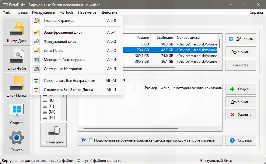 - Функция виртуальный диск позволяет смонтировать файл как отдельный логический диск, что удобно для работы с образами, переносимыми данными и тестированием.