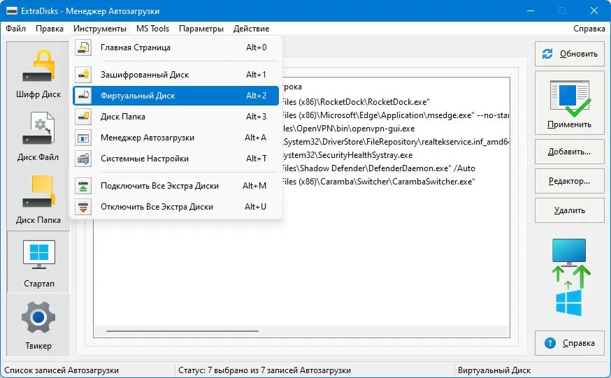 - Управление автозагрузкой приложений и сторонних виртуальных устройств