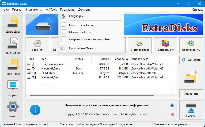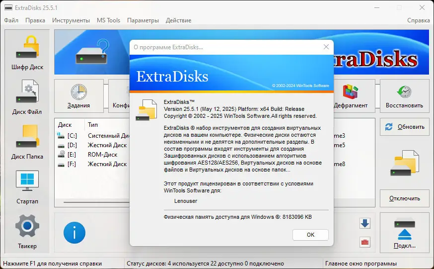 ExtraDisks — это набор системных инструментов для создания и управления виртуальными дисками, включая зашифрованные, файловые и каталоговые диски, а также инструменты для настройки автозагрузки и параметров операционной системы. Программа работает без изменения структуры физических дисков и не требует разметки разделов, обеспечивая безопасность и удобство при работе с данными.