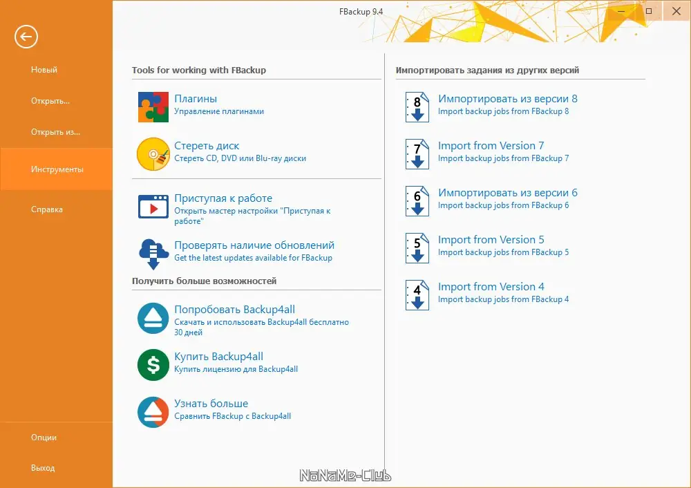 - Поддержка резервного копирования на USB и Firewire-устройства, локальные и сетевые папки