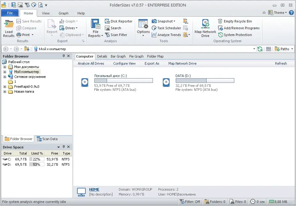 FolderSizes — это мощная система анализа дискового пространства, предназначенная для детального просмотра структуры файлов и папок на локальных и сетевых дисках. Программа отображает информацию в цифровом и графическом виде, включая диаграммы и древовидные карты, что упрощает выявление объемных файлов и неиспользуемых данных. С её помощью можно быстро оптимизировать хранение, освободить место и поддерживать порядок в файловой системе.
