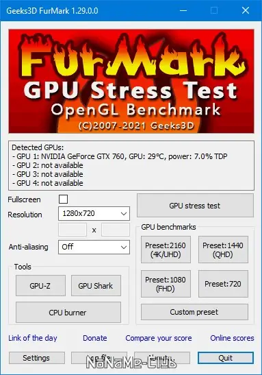 Утилита FurMark предназначена для стресс-тестирования видеокарт, поддерживаемых через API OpenGL. Программа позволяет оценить производительность графического адаптера, проверить стабильность системы охлаждения и выявить возможные сбои при высоких нагрузках. Особенно востребована среди пользователей, занимающихся разгоном оборудования.