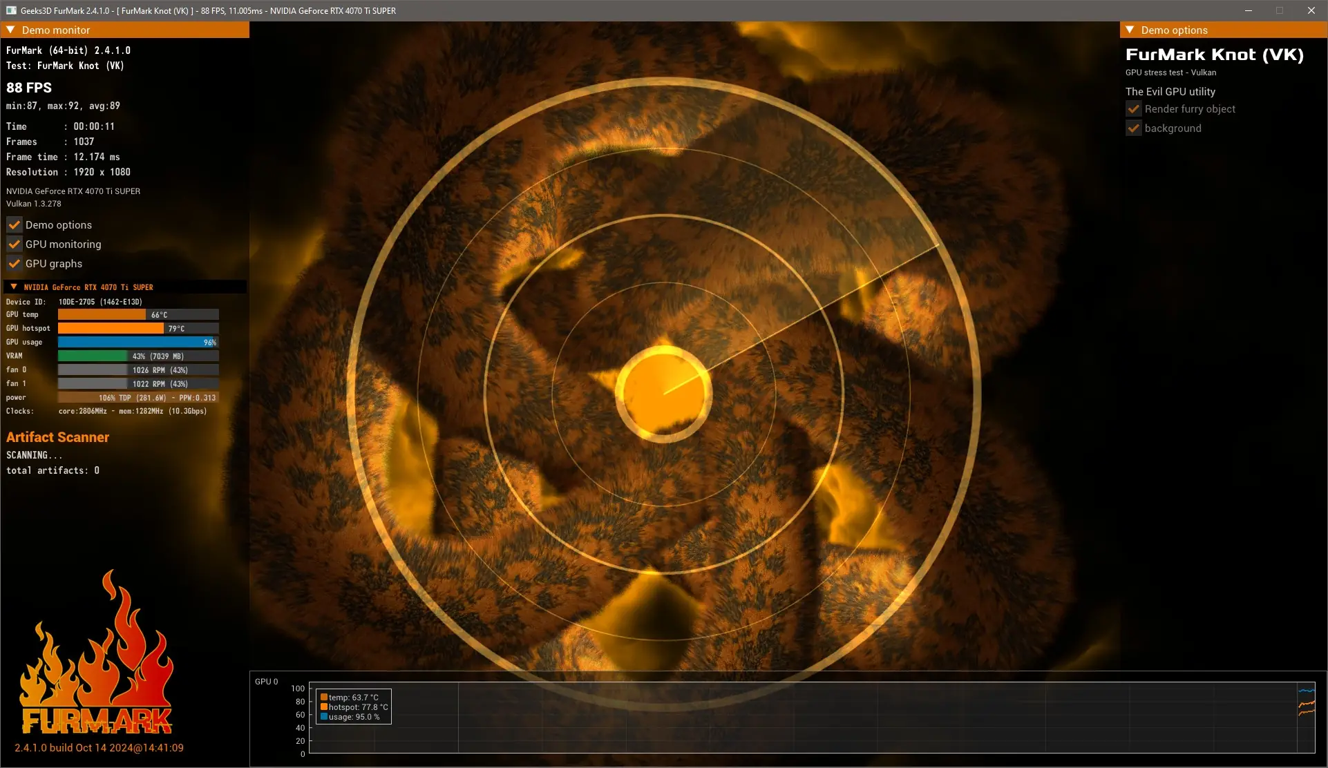Запуск FurMark не требует сложной настройки. После открытия программы пользователь может выбрать режим оконного или полноэкранного отображения, задать желаемое разрешение и уровень сглаживания. Для запуска стресс теста достаточно нажать кнопку «GPU Stress Test» и наблюдать за температурой, частотами и поведением системы в реальном времени. В настройках доступен таймер, ограничивающий длительность теста, а также опция активации GPU-сканера.