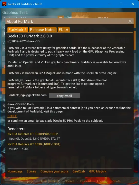 FurMark 2 — мощная утилита для глубокого тестирования производительности и стабильности видеокарт под нагрузкой. Программа создаёт экстремальные условия для GPU, что делает её незаменимым инструментом при разгоне и диагностике. Поддержка современных графических API, включая OpenGL и Vulkan, позволяет проводить 3d стресс тесты с высокой точностью и надёжностью.