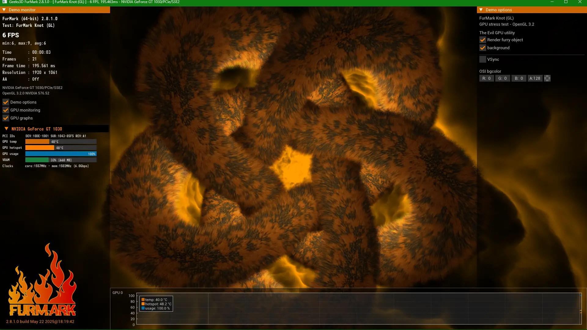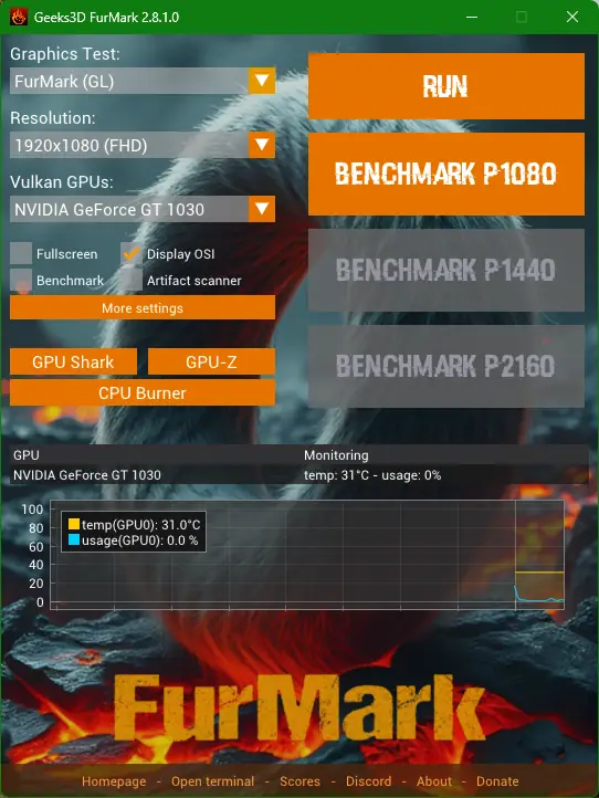 Запуск FurMark не требует установки — портативная версия работает с любого носителя, включая USB-флешки. После запуска пользователь может выбрать разрешение, режим отображения и длительность теста. Для начала нагрузки достаточно нажать кнопку «GPU Stress Test» и наблюдать за показателями температуры, загрузки и частоты в реальном времени.