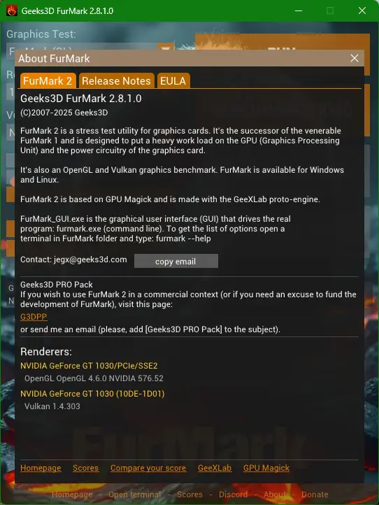 Программа FurMark 2 — это мощный стресс тест для видеокарт, предназначенный для проверки стабильности и производительности графических адаптеров под высокой нагрузкой. Утилита поддерживает современные API, включая OpenGL и Vulkan, и позволяет проводить интенсивное тестирование с контролем температуры, частот и потребления энергии. Подходит как для оверклокеров, так и для пользователей, желающих оценить состояние системы охлаждения.