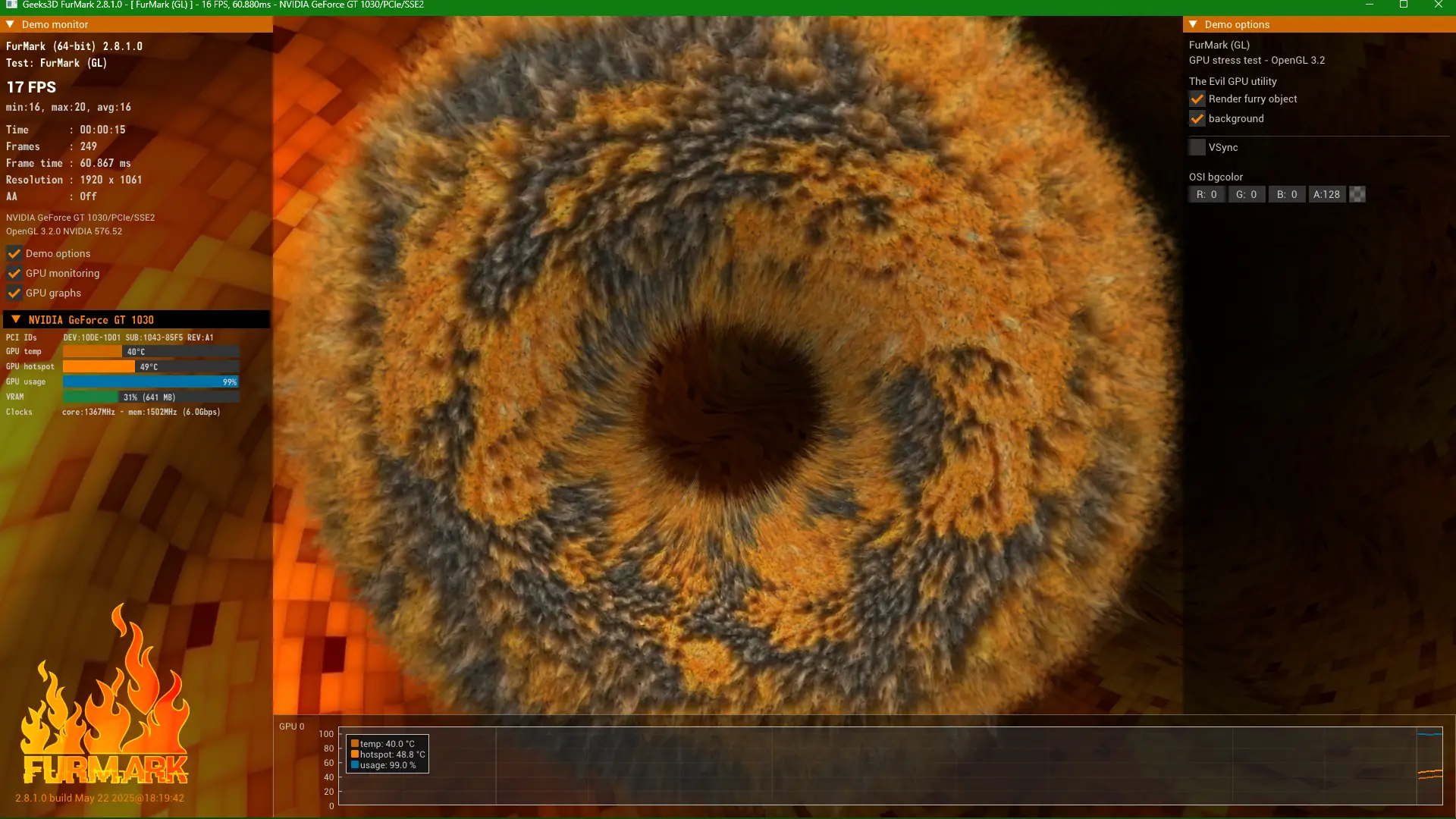 FurMark 2 представляет собой обновлённую версию известной утилиты для тестирования графических процессоров, созданную на базе движка GeeXLab. Программа генерирует высоконагруженное 3d-изображение, имитирующее сложные расчёты освещения и теней, что позволяет максимально загрузить GPU. Это делает её одним из самых эффективных инструментов для стресс теста, особенно при разгоне или диагностики перегрева.