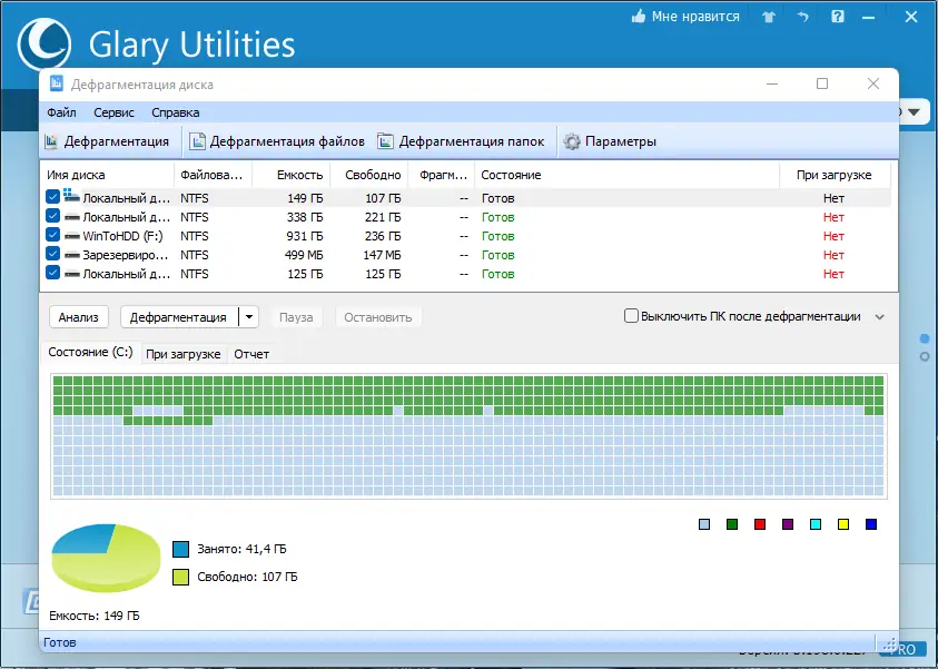 - Анализатор диска визуализирует распределение файлов по папкам, помогая быстро выявить объёмные элементы и освободить место.