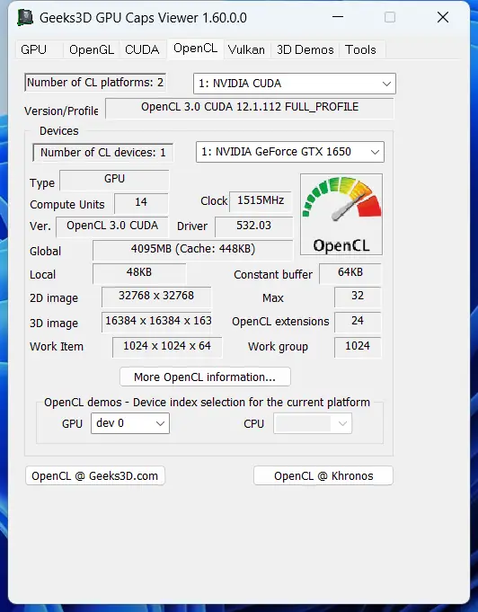 - Проверка поддержки расширений OpenGL и OpenCL для оценки совместимости с современными приложениями.