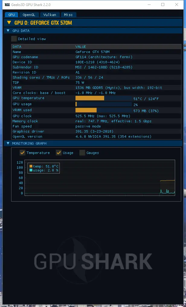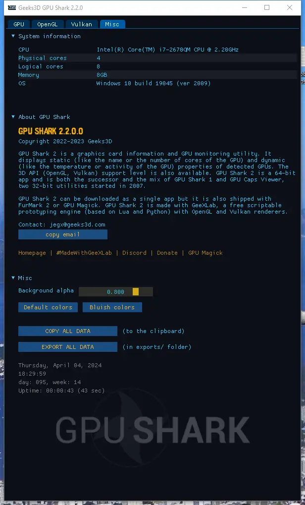 После запуска GPU Shark 2 интерфейс отображает основные параметры видеокарты на главной вкладке. Пользователь может наблюдать за изменениями температуры, загрузкой ядра и видеопамяти, а также за тактовыми частотами в динамике. На вкладке «Misc» доступна функция экспорта всей информации в текстовый файл или копирования в буфер обмена для дальнейшего анализа. Для точной работы с высоким разрешением экрана реализована поддержка масштабирования DPI, что улучшает читаемость на современных мониторах. Программа автоматически определяет доступные датчики и скрывает недоступные, избегая ошибок отображения.