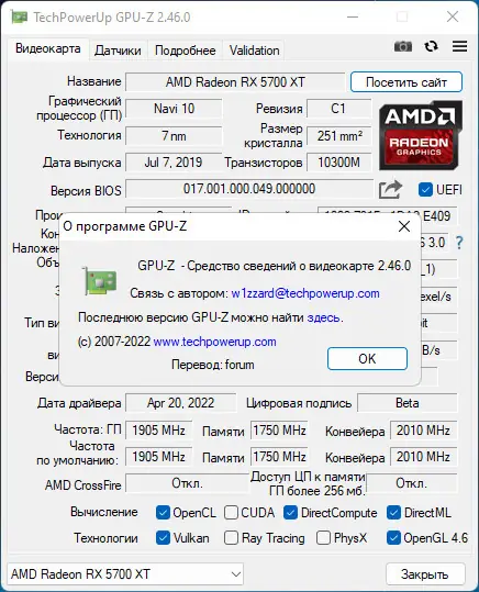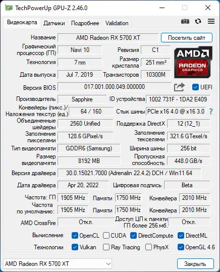 Программа GPU-Z предоставляет пользователям исчерпывающие сведения о состоянии и параметрах графического адаптера. Она поддерживает устройства от NVIDIA, AMD и Intel, что делает её универсальным инструментом для анализа видеокарт в различных конфигурациях. Утилита отображает ключевые параметры, такие как модель GPU, ревизия чипа, объём и тип видеопамяти, разрядность шины, версия драйвера и VBIOS. Также доступна информация о поддерживаемых технологиях, включая DirectX, OpenGL и Vulkan, что особенно полезно при оценке совместимости с современными приложениями и играми.