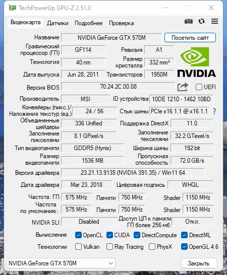 GPU-Z предоставляет исчерпывающую информацию о видеоконтроллере, установленном в системе. Утилита определяет модель графического процессора, его архитектуру, объём и тип видеопамяти, разрядность шины данных, а также версию и дату выпуска видеобиоса. Также отображается информация о текущей версии драйвера, поддержке технологий DirectX, OpenGL, Vulkan и OpenCL, что особенно полезно при настройке игр и приложений, требующих определённых графических возможностей.