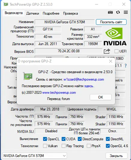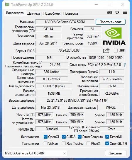 - Отображает детальную информацию о графическом процессоре, включая архитектуру, техпроцесс и производителя