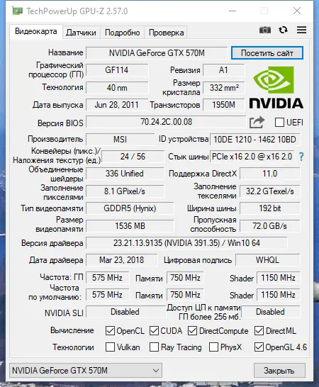 - Отображение детальных сведений о графическом процессоре и видеопамяти