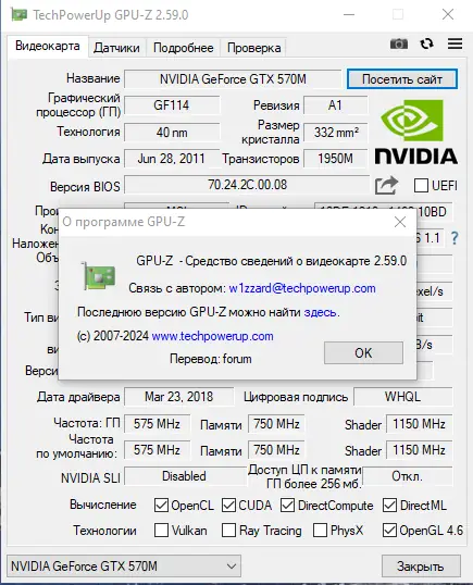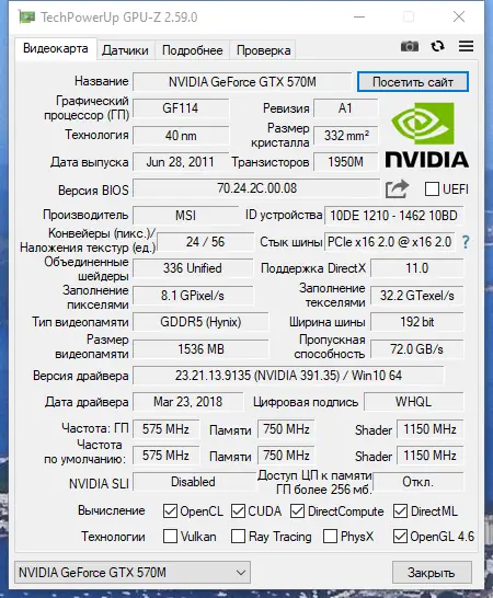 - Отображает полные технические характеристики GPU, включая архитектуру, техпроцесс и поддерживаемые API