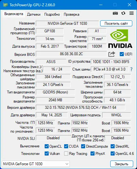- Отображение полных спецификаций графического адаптера, включая архитектуру чипа и технологический процесс