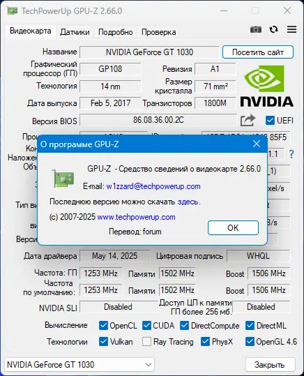 GPU-Z — это компактная утилита для диагностики и мониторинга видеокарт, предоставляющая полную информацию о графическом процессоре, видеопамяти, версии BIOS, драйверов и текущем состоянии системы охлаждения. Программа поддерживает устройства от NVIDIA, AMD и Intel, отображая как базовые характеристики, так и данные в реальном времени с датчиков. Легковесное приложение не требует установки и удобно для использования при настройке, разгоне или тестировании графических адаптеров.