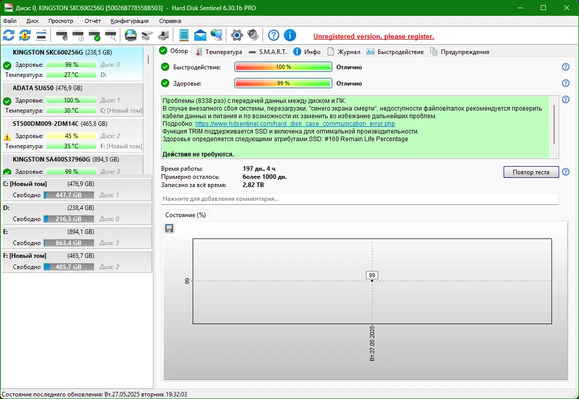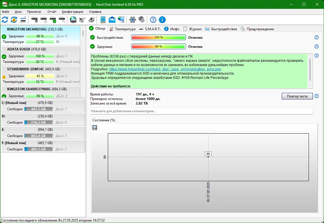 Hard Disk Sentinel — это мощное приложение для диагностики и контроля состояния жестких дисков и твердотельных накопителей. Программа обеспечивает постоянный мониторинг температуры, S.M.A.R.T.-параметров, скорости передачи данных и общего ресурса накопителей, предупреждая пользователя о возможных сбоях до их наступления. Благодаря фоновой работе и детальному анализу, она помогает избежать потери ценных данных и своевременно принимать меры по замене изношенных устройств.