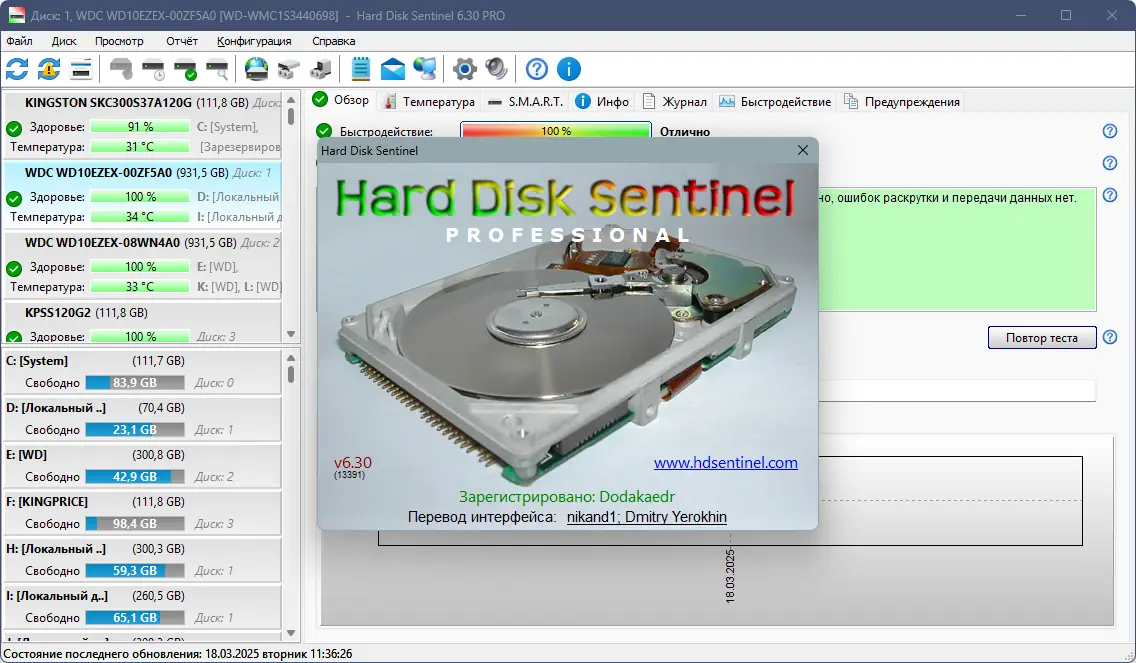 Hard Disk Sentinel — это мощное программное обеспечение для диагностики, мониторинга и обслуживания жёстких дисков и твердотельных накопителей. Утилита в реальном времени анализирует состояние HDD и SSD, отслеживает температуру, производительность и параметры S.M.A.R.T., позволяя заранее выявить признаки возможного отказа. Программа помогает сохранить важные данные, предупреждая пользователя о критических изменениях в работе накопителей.