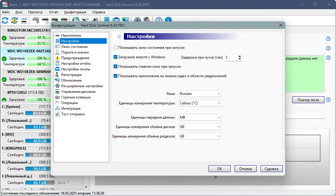 После установки программа автоматически запускается и начинает сканирование всех подключённых накопителей. Главное окно отображает список дисков с индикаторами состояния, температурой и использованного пространства. Пользователь может перейти в детальный режим просмотра, где доступны графики нагрузки, история температур, статистика ошибок чтения/записи и общее время наработки. Настройки позволяют задать пороговые значения для оповещений, включить автоматическое завершение работы системы при перегреве и настроить режим тишины для HDD. Доступны тесты производительности и проверка поверхности диска на наличие бэд-блоков.