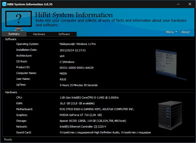 HiBit System Information позволяет получить полную картину состояния компьютера, включая технические характеристики оборудования и сведения о программной среде. Утилита организована по вкладкам, что обеспечивает удобную навигацию между различными категориями данных. На главной вкладке отображается сводная информация о системе, включая модель устройства, версию операционной системы, объём оперативной памяти и тип процессора.