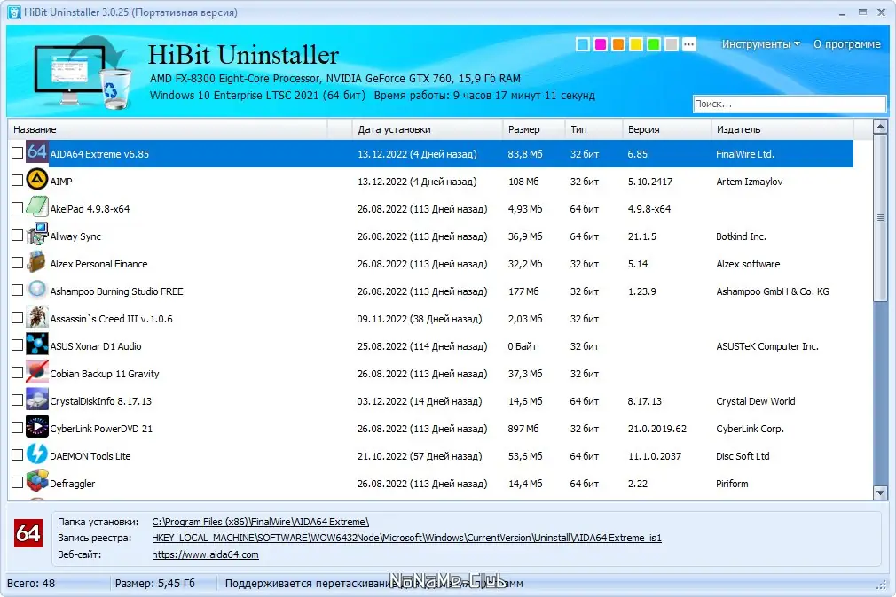 HiBit Uninstaller — это мощная утилита для полного и безопасного удаления программ в операционных системах Windows, сочетающая простоту интерфейса с расширенными функциями очистки системы и управления компонентами. Программа эффективно удаляет как стандартные приложения, так и встроенные компоненты Windows Store, оставляя после себя минимальные следы. Благодаря встроенным инструментам оптимизации, она подходит как для новичков, так и для продвинутых пользователей, стремящихся поддерживать систему в чистоте и порядке.