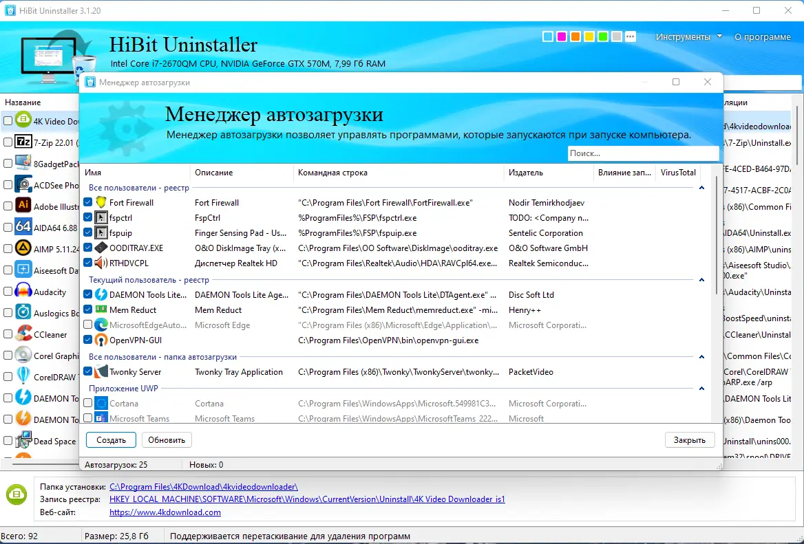 - Включает менеджер автозапуска, позволяющий контролировать программы, запускающиеся при старте системы.